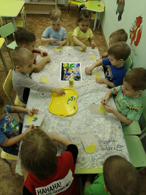 Задачи: Учить детей создавать образ репки, наносить клей на заготовки бумаги желтого и зеленого цвета в пределах заданного контура. Развивать чувство формы, мелкую моторику.